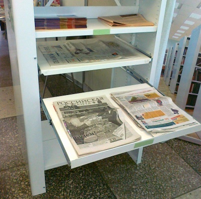 Читальный зал библиотеки. На нижних полках стеллажа выложены журналы. В средней части находятся выдвижные полки с передним бортиком для размещения подшивок газет. Выше перед обычной стационарной полкой установлена планка – карман для периодики.