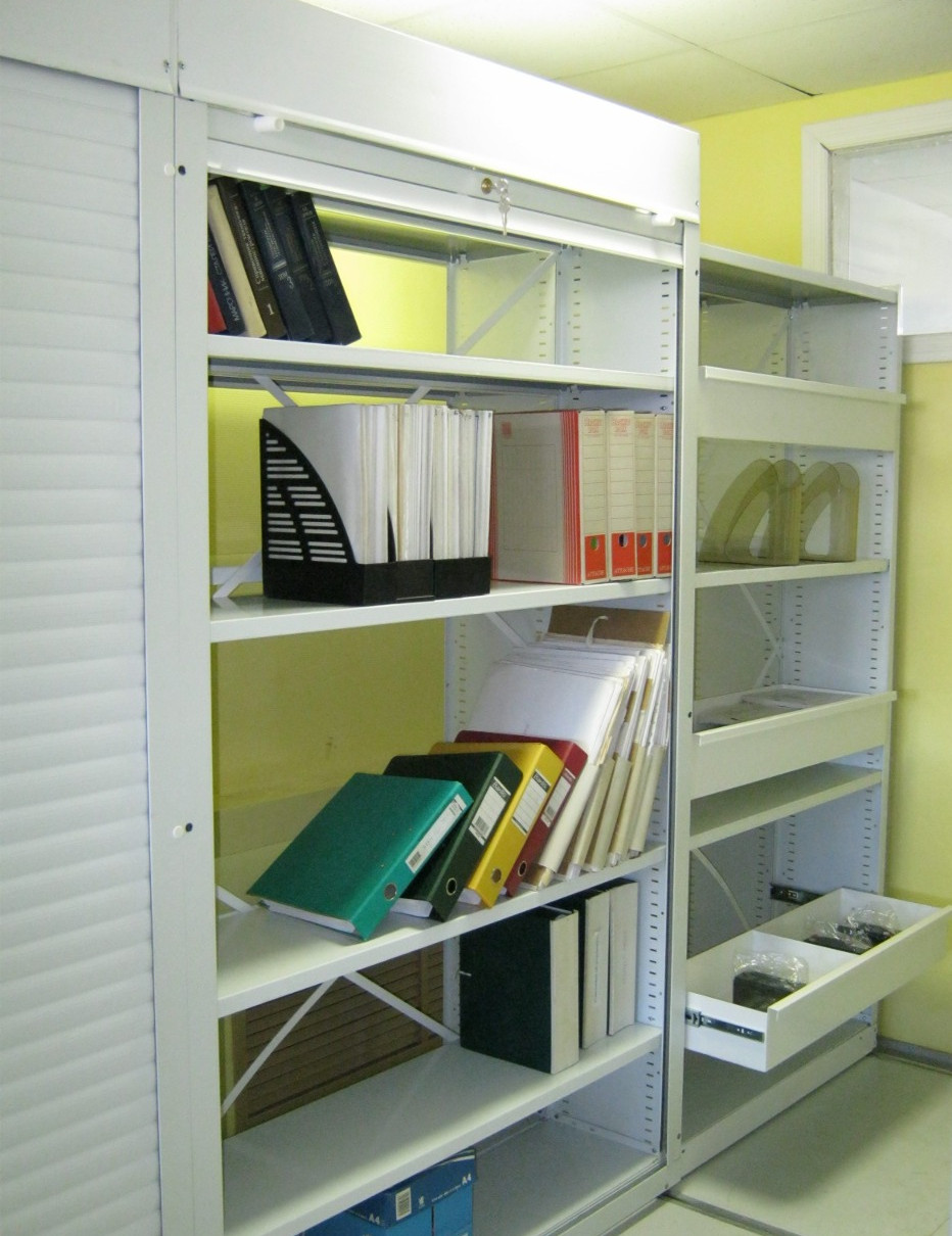 Папки документов стоят на полках мобильных стеллажей для офиса. Например личные дела хранятся в архиве кадровой службы. Обеспечивают экономию площади.